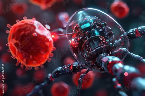 An advanced digital closeup of a medical nanobot navigating through the bloodstream