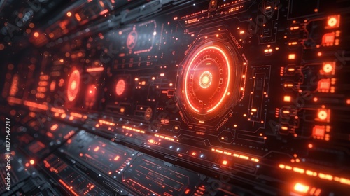 An advanced firewall interface with glowing red and orange icons, on a solid red background.