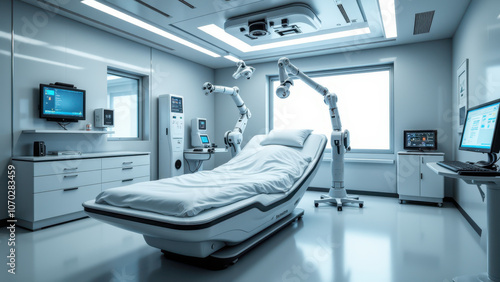 An advanced medical operating room with robotic equipment and modern technology.