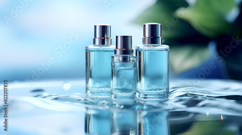 An advertisement for a moisturizer with water splashes. A bottle with fresh sparkling drops, a realistic 3D illustration, a cosmetic product