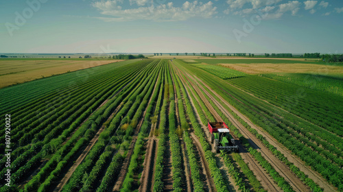 an aerial drone view of a vast agricultural complex, with fields of crops stretching to the horizon and tractors moving in orderly patterns, depicting the scale and efficiency