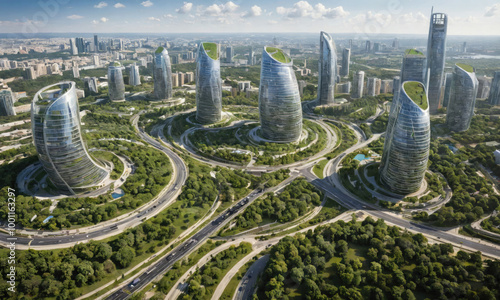 An aerial view of a futuristic city with tall, curved buildings surrounded by greenery and winding roads
