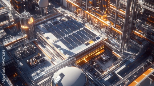 An aerial view of a robotics manufacturing facility with futuristic architecture, solar panels, and an efficient layout