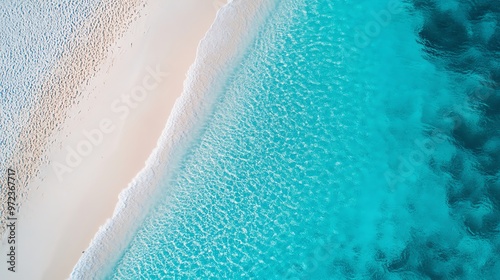 An aerial view of crystal clear ocean water crashing on a pristine white sandy beach.