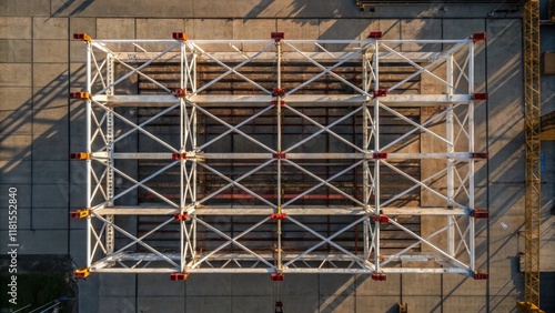 An aerial view of preassembled overhead supports stacked in an organized manner on scaffolding. The contrasting lines and shapes form an abstract pattern that speaks to the