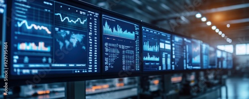 An aerospace manufacturing plant bustling with activity, with economic charts prominently displayed on digital screens