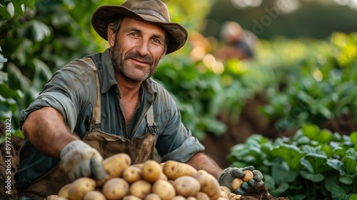 An agricultural worker diligently collects ripe, golden potatoes amidst lush green foliage under the soft light of the sun, showcasing the hard work involved in sustainable farming practices.