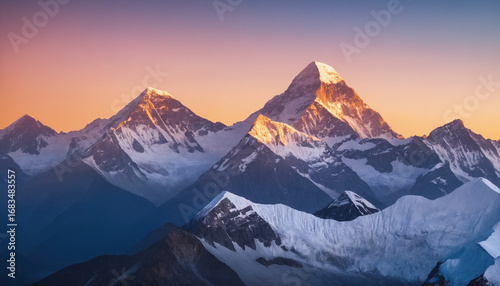 "View from a high Himalayan ridge with golden sunrise hitting the peak of Mount Everest, snow and ice glistening, extreme adventure photography style."