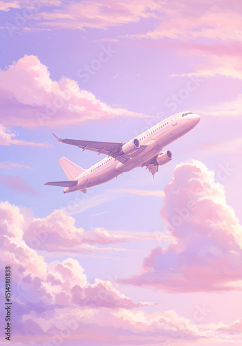 An airplane gracefully ascends through a sky filled with pastel-colored, fluffy clouds.