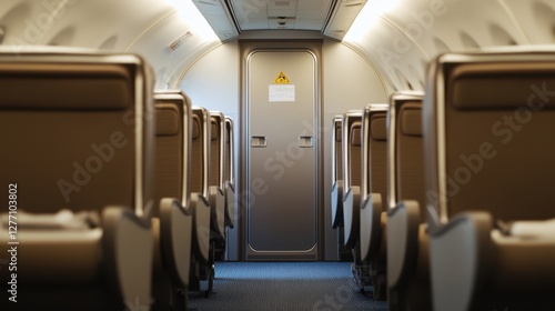 An airplane interior showcases numerous seats with an open door, inviting a glimpse into the cabin's spacious layout and design.