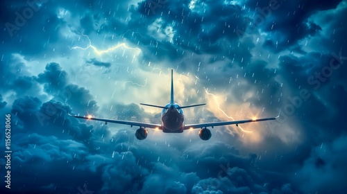 An airplane navigating through a thunderstorm with heavy rain and lightning illuminating the dark clouds at dusk