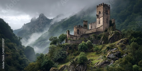 An ancient castle perches on a rocky cliff, surrounded by misty mountains and lush greenery. The serene scene captures a sense of history and majestic isolation.
