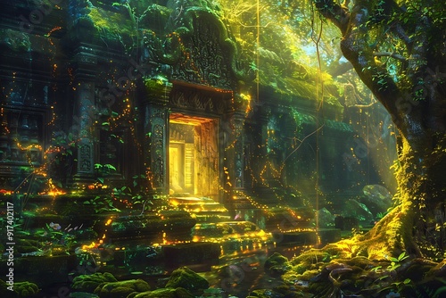 An ancient temple hidden in a luminous forest, glowing moss and vines, ethereal light filtering through trees. Mystical and serene, dreamlike ambiance, vibrant hues