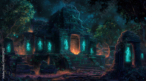 An ancient temple with bioluminescent carvings and glowing pathways, nestled in a mystical forest. Glowing Bioluminescence. Illustration