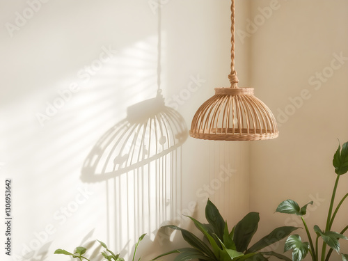 An antique birdcage with flowers, a decorative interior object, casts a soft light like a vintage lampshade