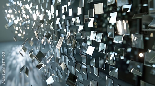 An artistic display of small, square mirrors, each angled slightly differently to reflect light across the room