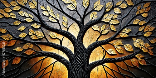 An artistic golden leaf tree featuring intricate black branches and a textured, stylized background
