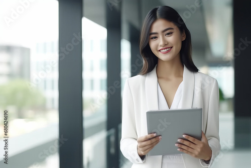 An asian businesswoman in white suit with digital tablet in hands, on a background of office space in blur. Selective focus, shallow depth of field