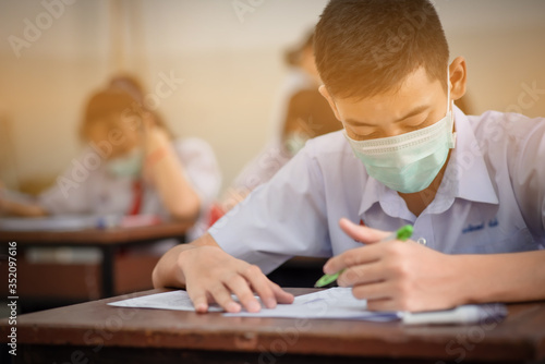 An Asian high school students in a white school uniform wearing a mask to do final exams in the midst of Coronavirus disease 2019 (COVID-19) epidemic and PM 2.5.