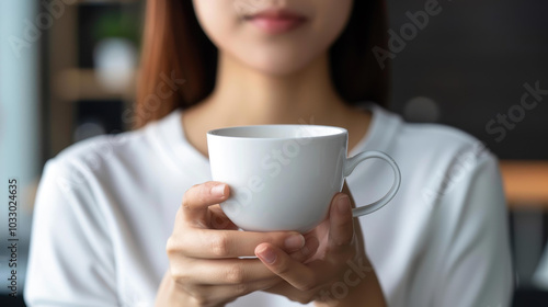 An Asian woman enjoys a coffee break in a bright office while brainstorming ideas with her team.