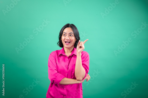 An Asian woman in a vibrant pink shirt stands against a green background, looking cheerful and pointing upwards with one hand, as if indicating a bright idea or something exciting