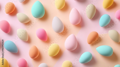 An assortment of beauty blenders in different shapes and colors arranged in a neat, playful pattern on a pastel background.