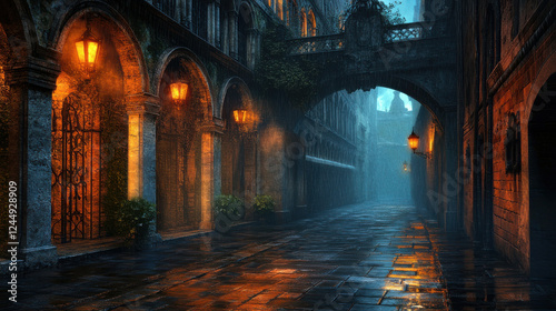 An atmospheric urban passageway, empty and silent, dense mist creeping through the scene