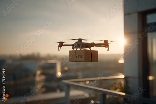 An autonomous drone delivers a package against a vibrant urban sunset backdrop.