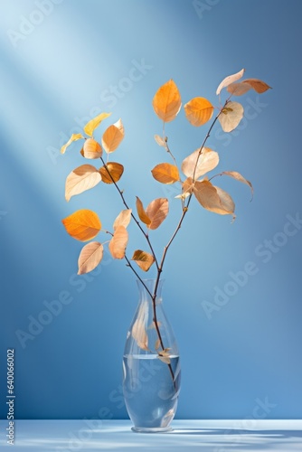 An autumn branch with leaves placed in a vase filled with water, set against a blue background, emphasizing minimalism