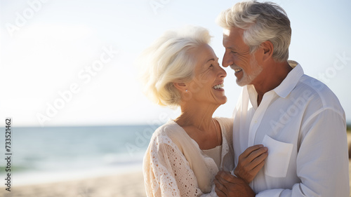 An elderly couple stand and smile happy feeling and chilling on the beach.