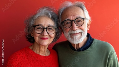 An elderly couple with glasses stands close together, smiling with joy against a striking red background. Their warm expressions convey happiness and companionship in this colorful setting