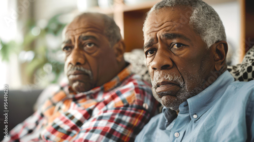 An elderly gay couple is sitting on the couch. Two puzzled elderly black men are sitting on the couch and thinking about something. The concept of relationships