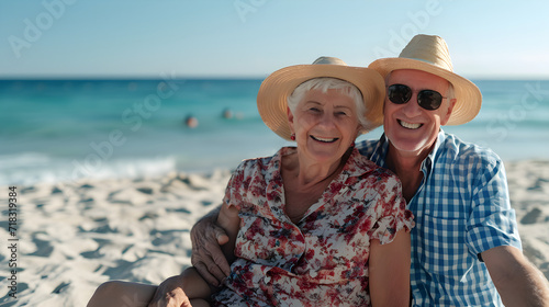 An elderly man and woman smile and relax on the shore of the blue ocean