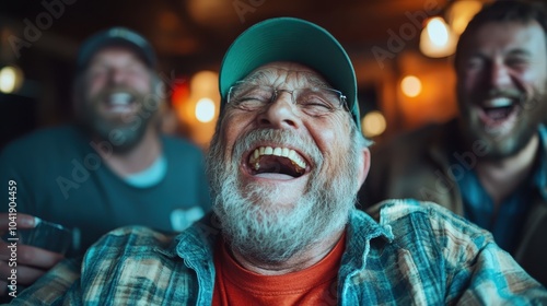 An elderly man wearing a cap and plaid shirt is captured laughing heartily, filling the room with joy and envelopment in a spirit of jovial camaraderie.