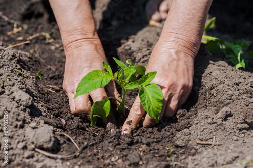 An elderly woman gardener plants a green tomato seedling with her hands in wet watered soil from the garden on a plantation. Photography, agriculture, gardening concept, growing vegetables.