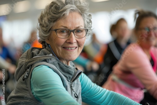 An elderly woman with gray hair and glasses, dressed in cozy blue activewear, is cycling at a gym, reflecting healthy aging and a lively fitness atmosphere.