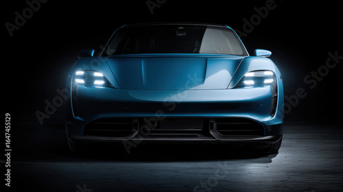 An electric vehicle stands prominently in a dark setting, with its headlights glowing