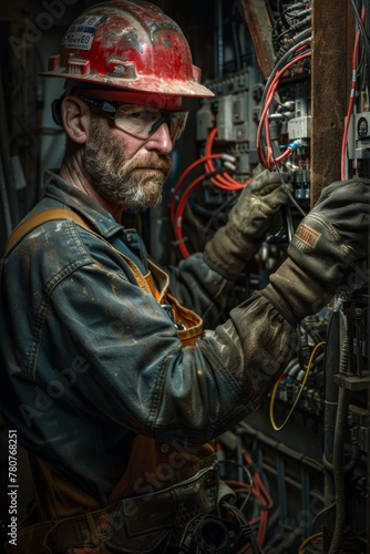 an electrician clad in overalls and a hard hat is depicted meticulously attending to an electrical panel