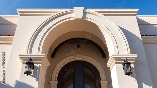 An elegant arched doorway of a luxurious home, framed by a clear blue sky and natural daylight.