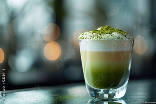 An elegant cup of matcha tea with a frothy, creamy foam on top, presented in a transparent glass. The vibrant green color of the matcha contrasts beautifully with the clear cup, highlighting its smoot