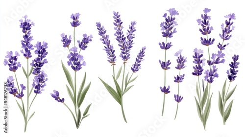 An elegant display of lavender flowers in varying arrangements, showcasing their vibrant purple hues and delicate foliage.
