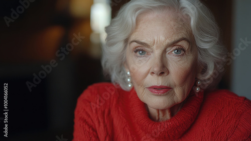 An elegant elderly woman with silver hair and pearl earrings wears a vibrant red sweater, reflecting on life in a cozy indoor setting