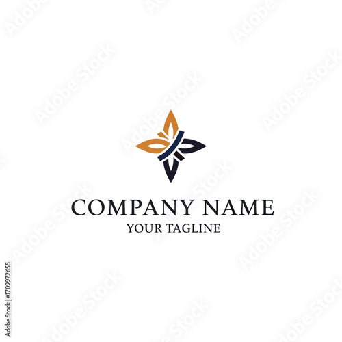 An elegant four-pointed star logo with interwoven gold and blue petals above placeholder company text.