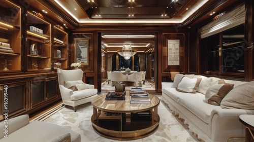 An elegant interior design scene with premium wood furniture, soft lighting, and tasteful decor, creating a luxurious and inviting atmosphere perfect for high-end living spaces