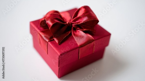 An elegant red gift box with a shiny bow sits on a plain white background,