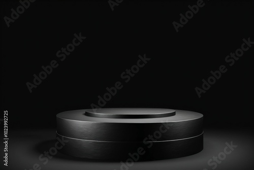 An empty dark grey round metal plate podium, creating a minimalistic design with no one present for products display