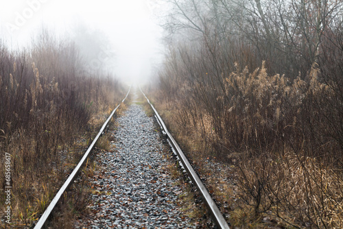 An empty old railway goes through a foggy forest