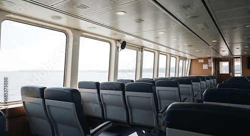 An Empty Passenger Cabin Inside A Modern Ferry Boat With Large Windows Overlooking The Ocean And Distant Shoreline On A Bright Day.