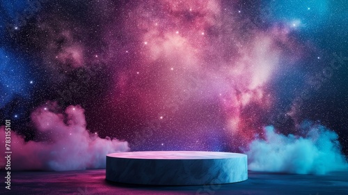 An empty round podium against the background of the starry night sky, in the galaxy. A space showcase for displaying goods. 3D rendering.