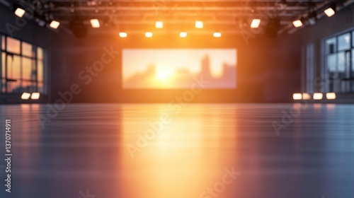 An empty studio or room, with a large screen and modern lights.